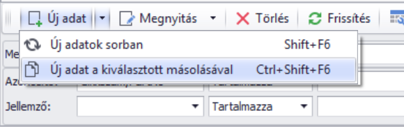 A termék állomány folyamatosan bővíthető, manuálisan a [Új adat] gombra kattintva az ablakon vagy importálással. Az [Új adat] / [Új adat a kiválasztott másolásával] gombbal a kiválasztott termék adatai alapján indíthatunk új termék rögzítést: