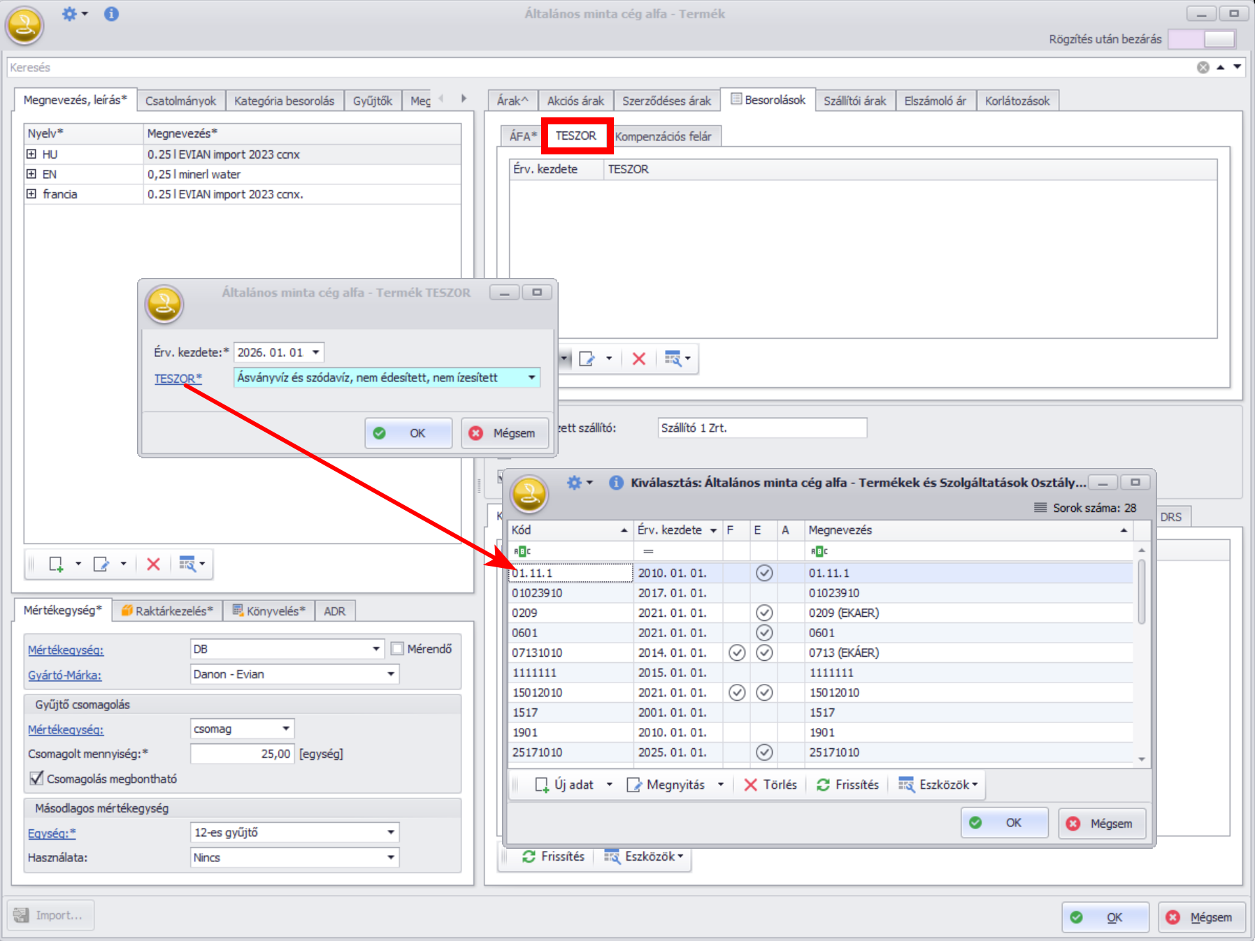 Csomagolás: adott termék másodlagos mértékegysége adható meg, valamint az alapegységből csomagolt mennyiség (a megbontható kapcsoló biztosítja az alapegységenkénti eladás szabályozását).