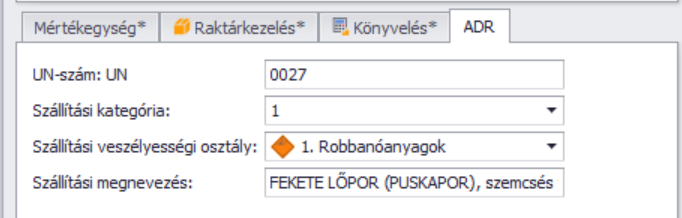 Egy termék adatlapján rögzíthetők a következő ADR-el kapcsolatos adatok: