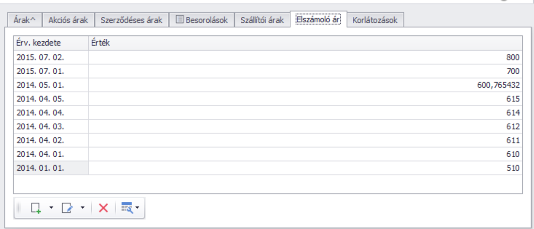 Amennyiben a terméket elszámolóáron kívánjuk nyilvántartani (bevételezni) ezen a fülön adhatjuk meg az elszámolóárat az érvényesség kezdetével: