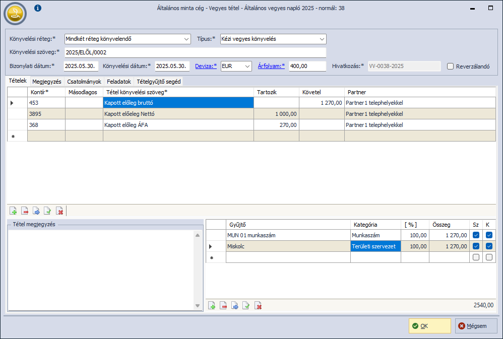 - Kézi vegyes könyvelés: alapértelmezett állapot, egyszerű vegyes bejegyzés