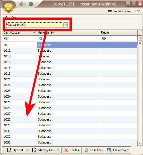 Az áttekintő ablakon az ország választása után van lehetőség az országhoz rendelt irányítószámokat kezelni.