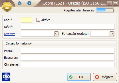A megnyíló ablakban tudjuk felvenni a kívánt ország adatait. Kötelező mező a kód, a név és a nyelv. Emellett meg kell adni, hogy aktív-e az ország, ezt később bármikor meg tudjuk változtatni.