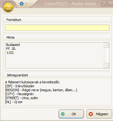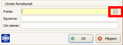 A Tallózás (F9) gombra (kis nagyító) kattintva megtekinthetjük a 3 címzési formátum helyes beírásának módját egyesével. Látható egy minta, valamint alatta a jelmagyarázat.