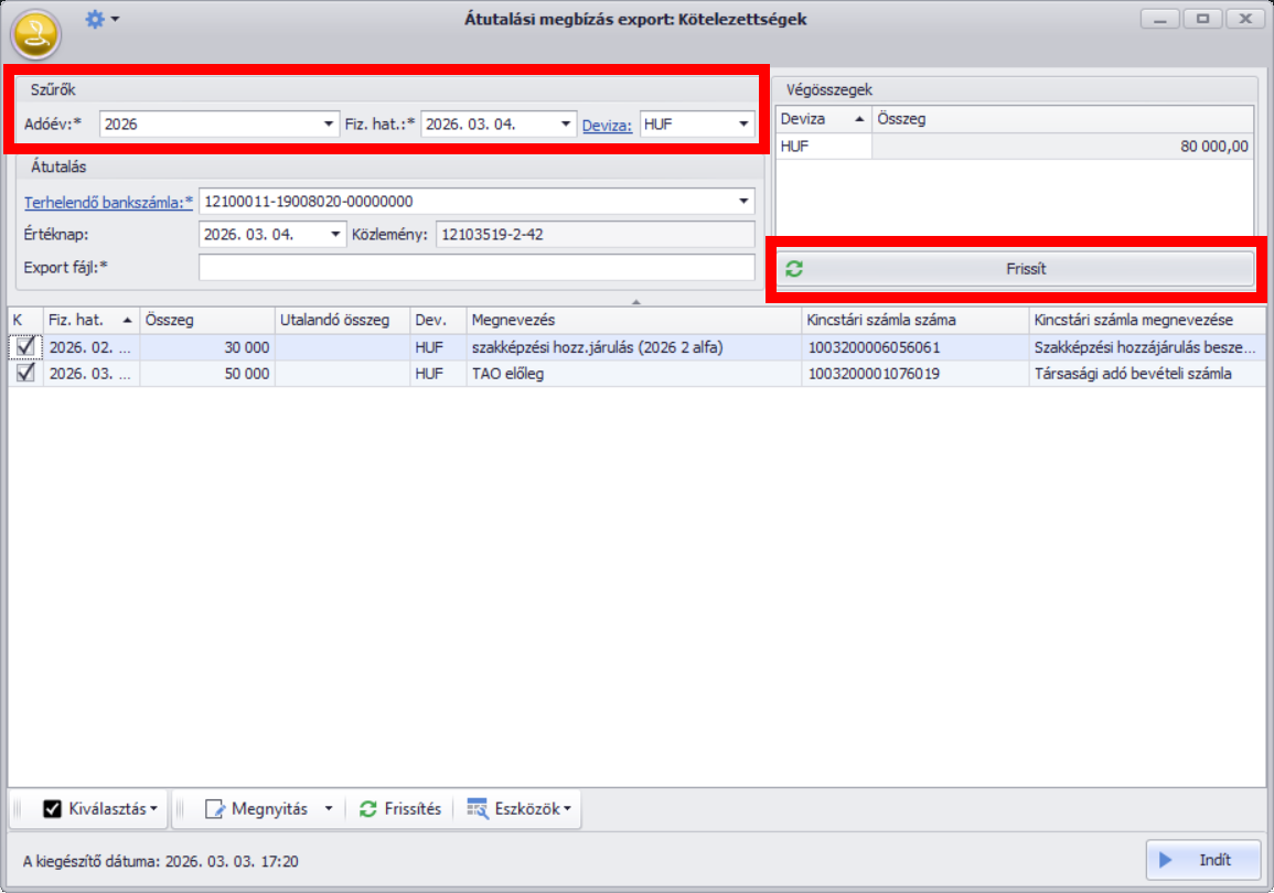 A szűrést devizára, határidőre és adóévre adhatjuk meg:
