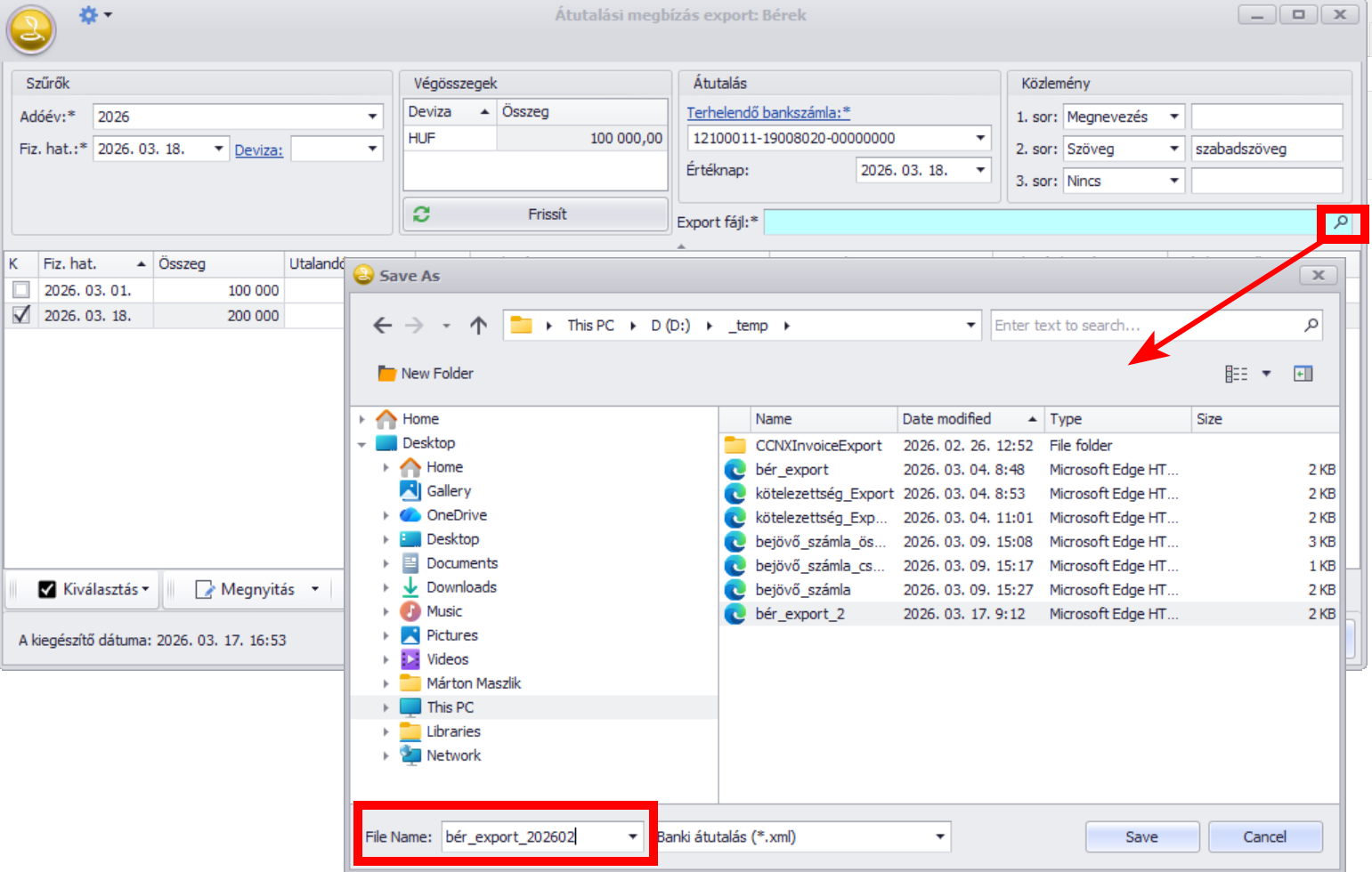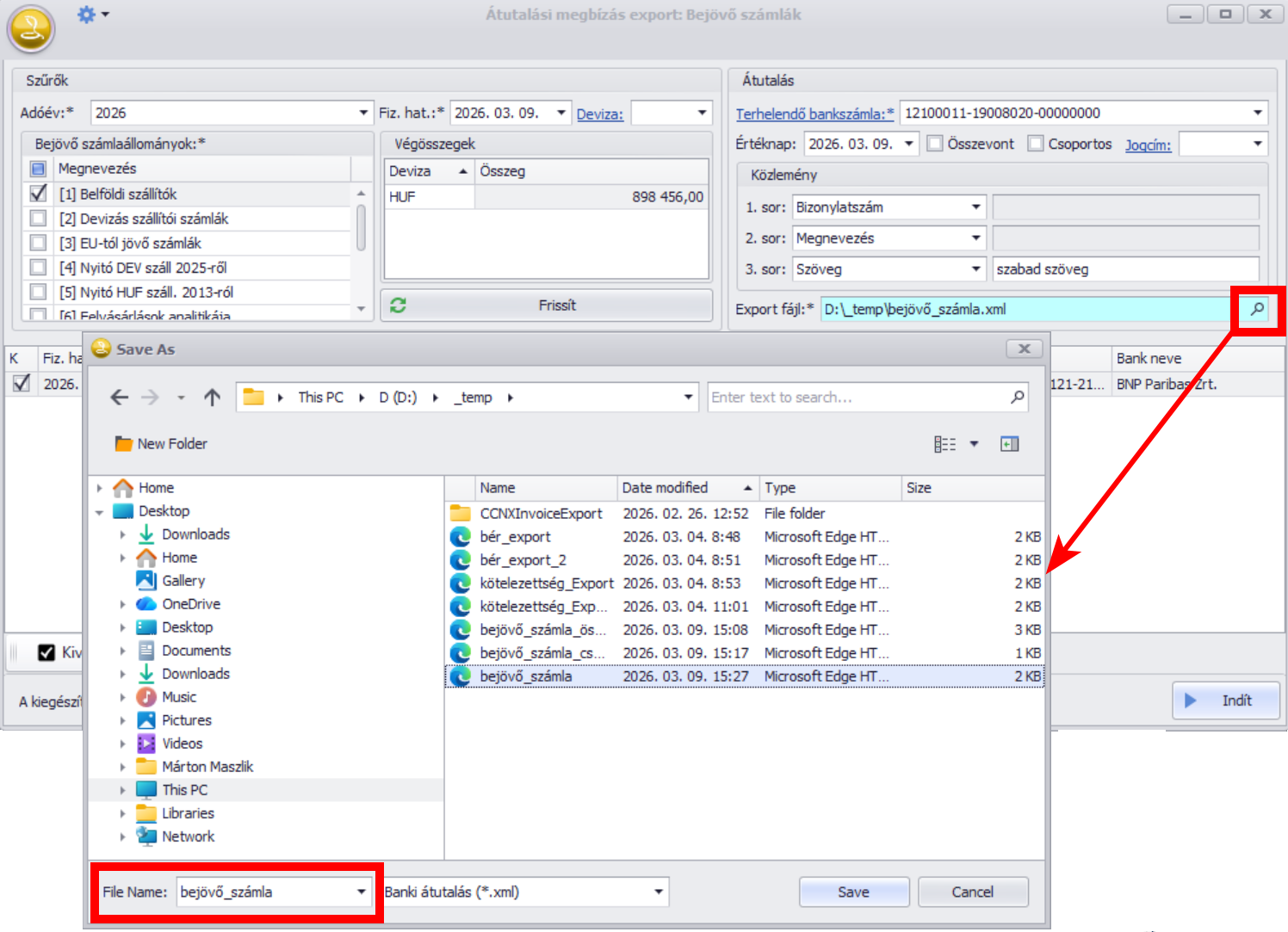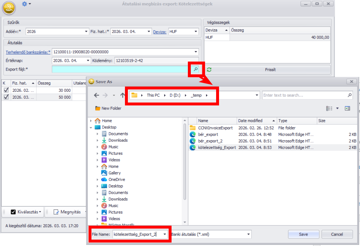 Ha mindezen adatokat kitöltöttük, az “Export fájl” mezőben kézzel vagy az F9 billentyűvel tallózva határozzuk meg, hova kerüljön és milyen néven a banki szoftverbe majd beolvasandó export fájl: