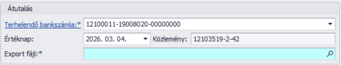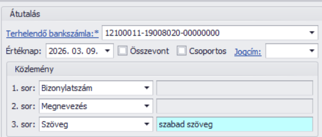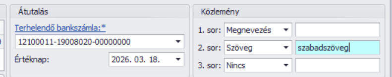 A szűrés után határozzuk meg, mely bankszámla számunkat kívánjuk terhelni, milyen értéknappal és közleménnyel. A közlemény 3 sorból tevődhet össze, automatikusan a bizonylat számát és megnevezését tudja a program feltüntetni, de a “Szöveg” opció kiválasztásával szabad szöveges módon is adhatunk meg közleményt: