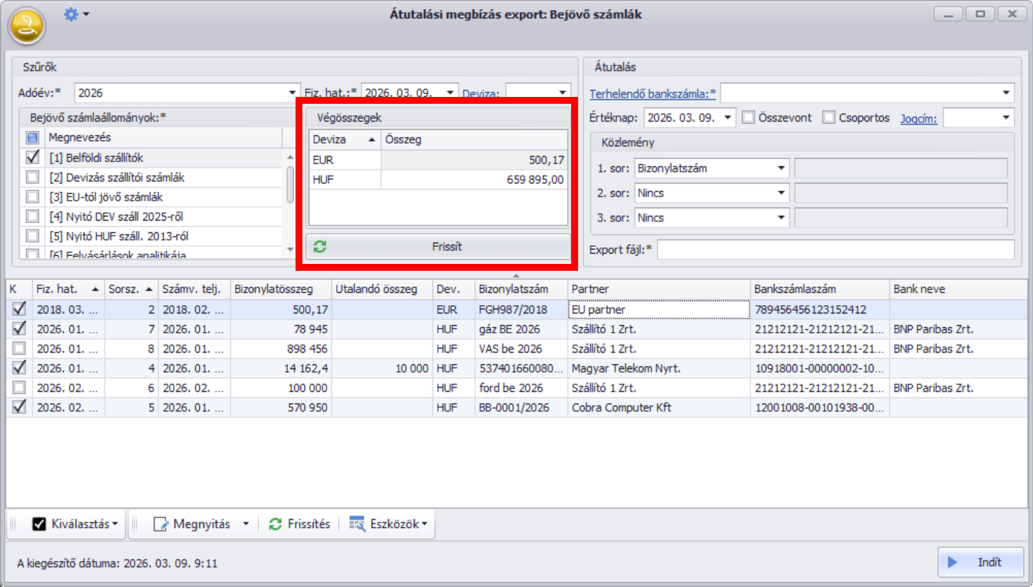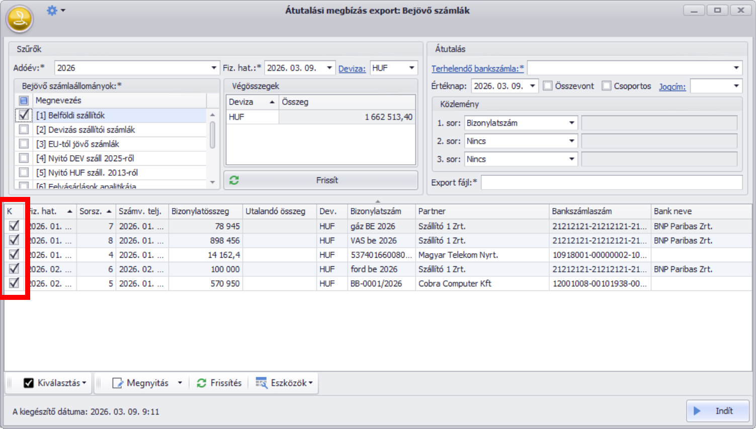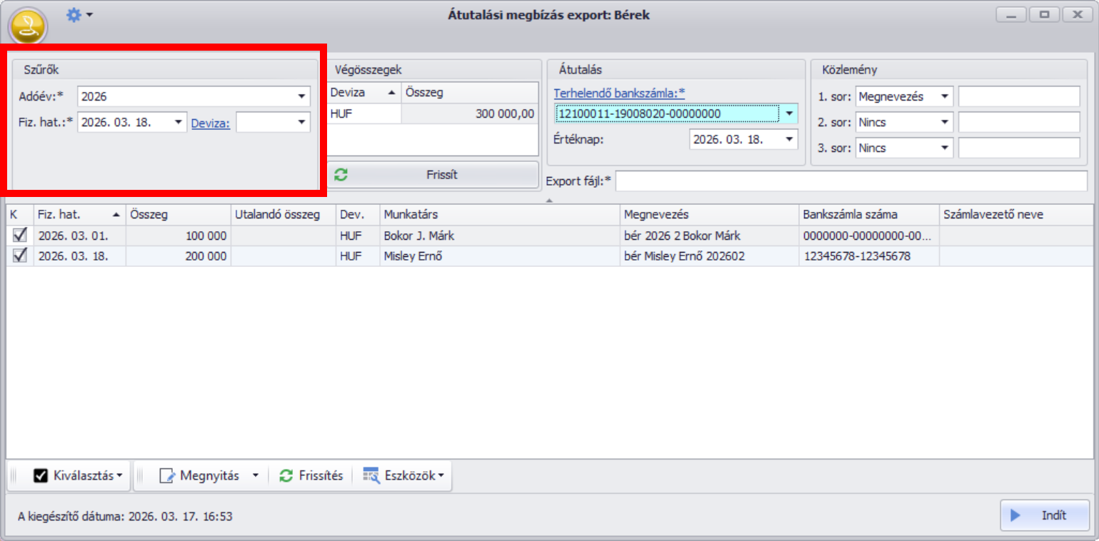 Legvégül nyomjuk meg az “Indít” gombot, mely a szükséges adatokat kiírja a megadott elérési útra az export fájlba, mely beolvasható ezután a banki szoftverbe.