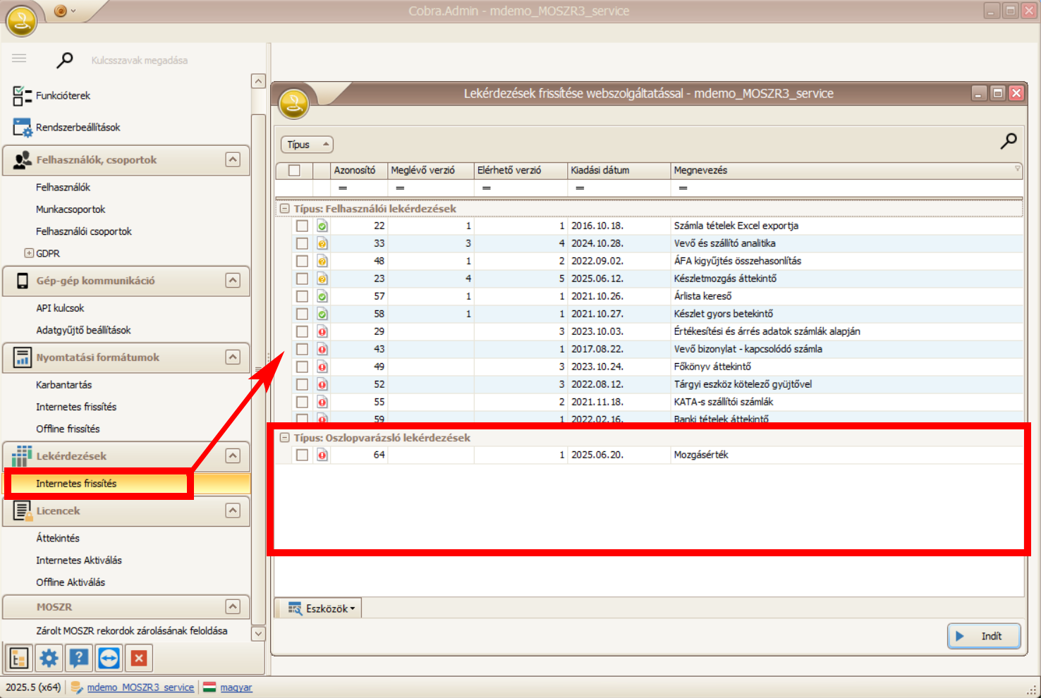 Az Oszlopvarázsló lekérdezések hasonlóan a Felhasználói lekérdezésekhez a Cobra Computer központi szerveréről tölthetők le Cobra.Admin program Főmenü / Lekérdezések / Internetes frissítés menüpontban: