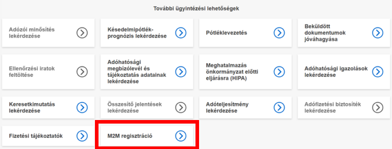 1. Jelentkezzünk be a https://ugyfelportal.nav.gov.hu/ oldalon és az oldal alján válassszuk az M2M regisztráció menüpontot: