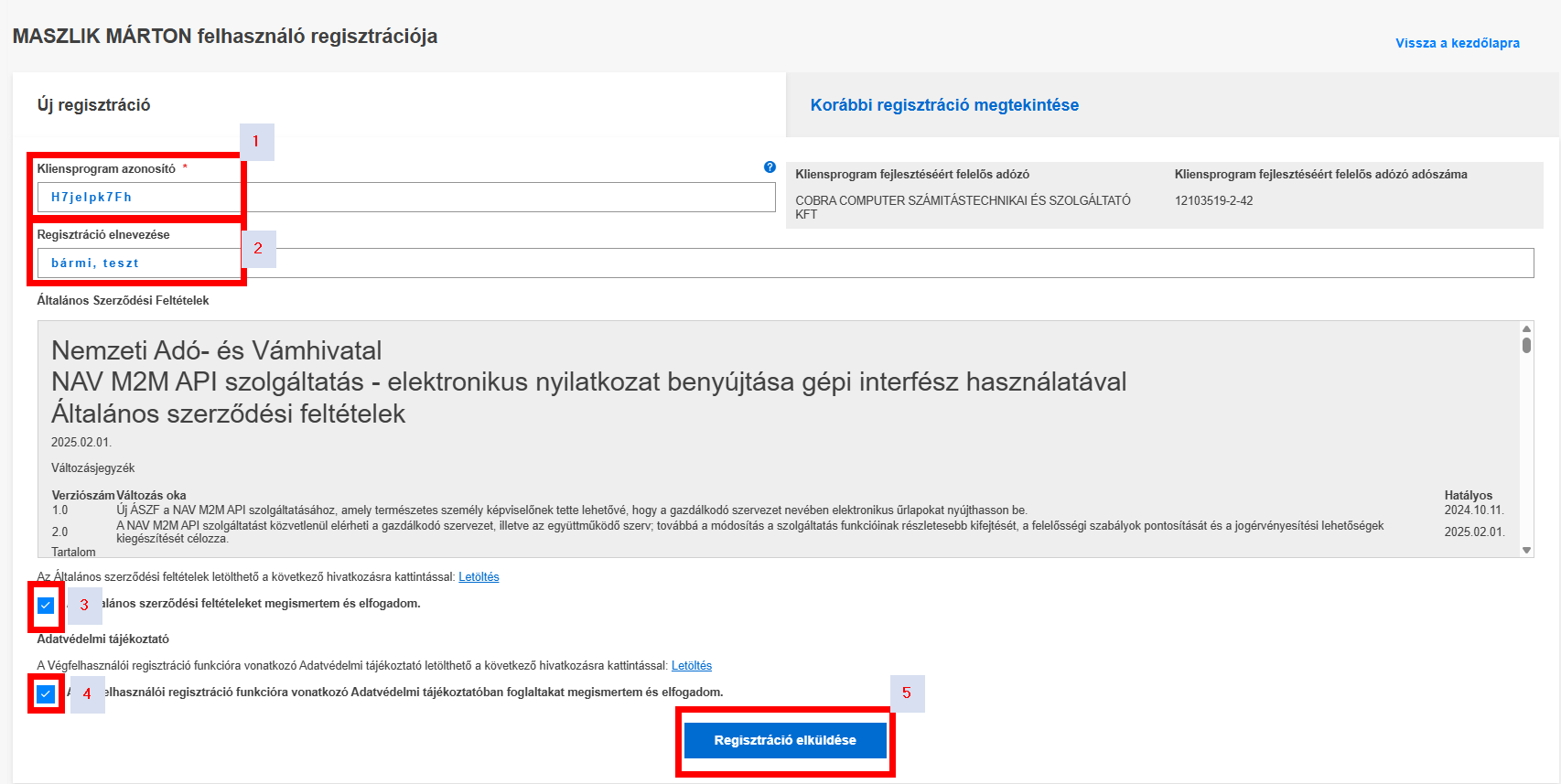 • végfelhasználó természetes személy, aki a CobraConto.Net program felhasználásával elektronikus űrlapokat nyújthat be: ez Ön vagy a könyvelője, aki képviseleti joggal rendelkezik és elvégzi a szolgáltatás használatához szükséges regisztrációt a NAV Ügyfélportál M2M-regisztráció alkalmazásában