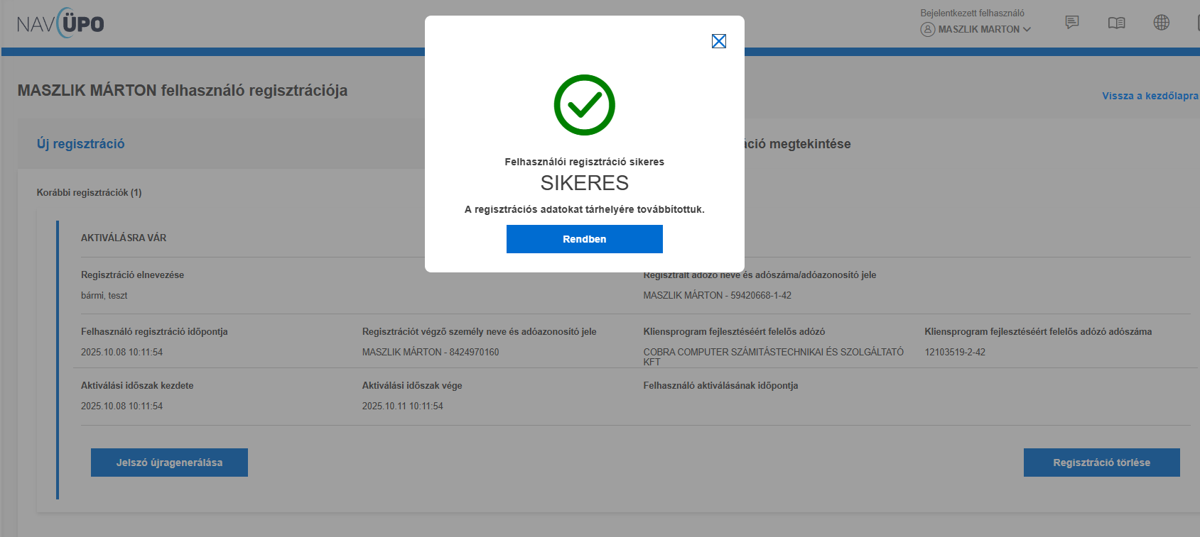 4. Sikeres regisztrációról kapunk tájékoztatást:
