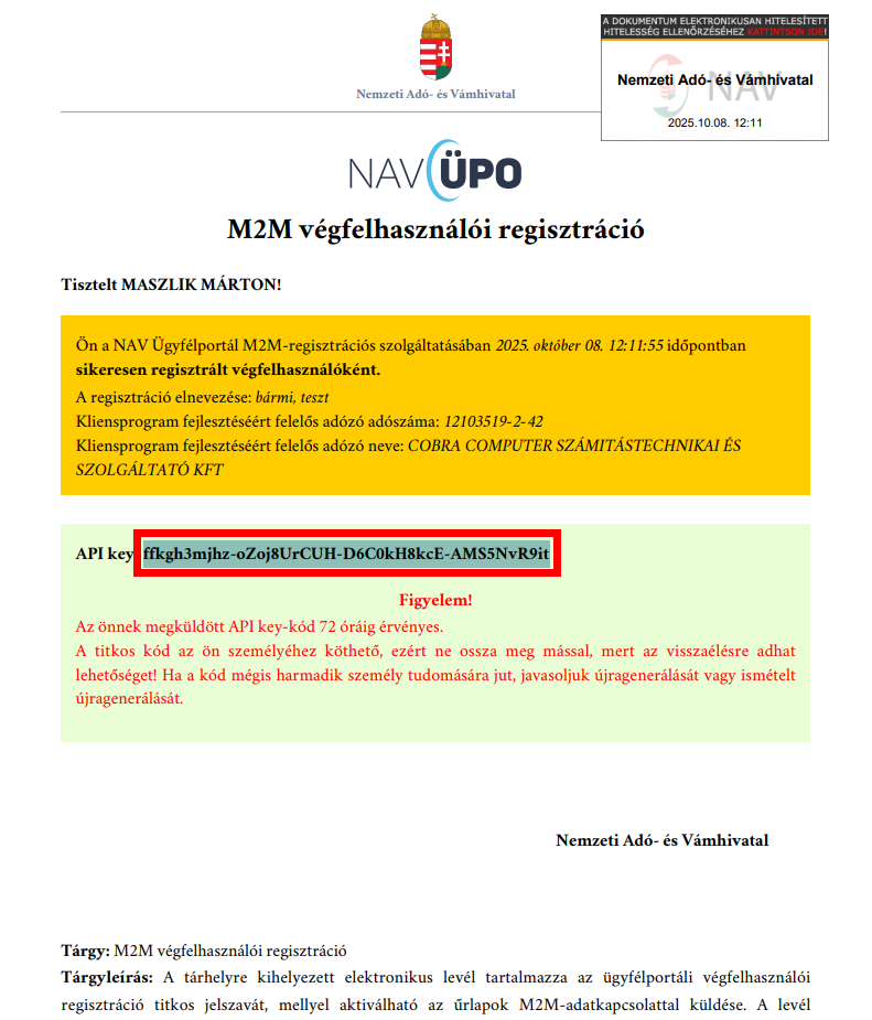 5. Ezután a terhelyünkre kapunk üzenetet “Értesítés M2M nyugta érkezéséről” tárggyal. Ezt töltsük le és nyissuk meg. A benne található API key nélkülözhetetlen lesz a program kommunikációs paramétereinek beállításáshoz, a PDF-et biztonságos helyre mentsük el!