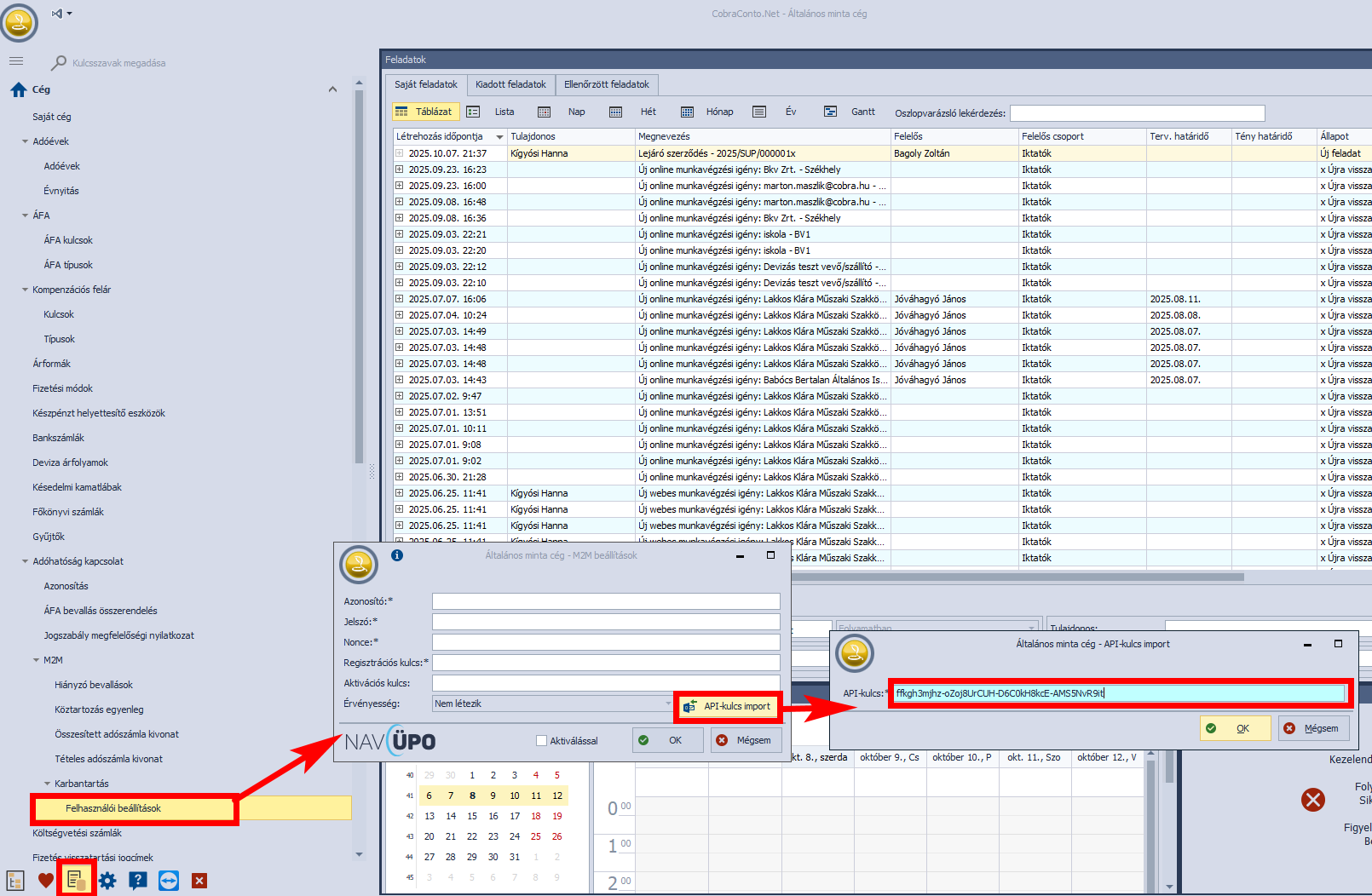 • a szoftverfejlesztő által létrehozott kliensprogram, amely a NAV szervereivel kommunikál: ez a CobraConto.Net, mely jogosultságot kapott a NAV-tól az M2M kommunikáció végzésére. Önnek ezzel nincs teendője.