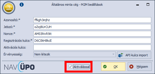 8. Visszatértünk ezzel a hitelesítő adatokat tartalmazó ablakra, ahol a program kitöltötte az első négy mezőt az API kulcs alapján. Aktiválni szükséges a felhasználót az első esetben, tehát az ablak leokézása előtt helyezzük ez az “Aktiválással” mezőben a pipát, majd nyomjuk meg az [OK] gombot: