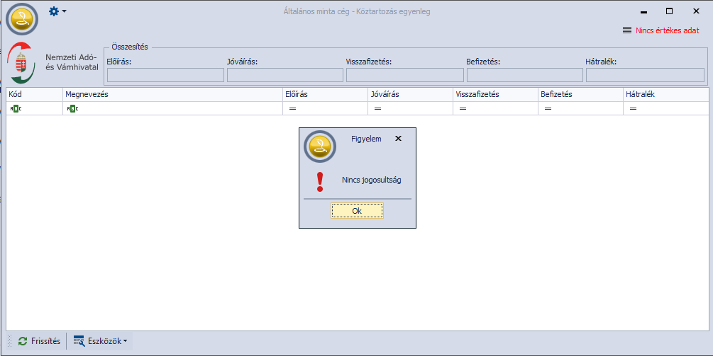 Amennyiben a lekérdezéseknél “Nincs jogosultság” figyelmeztetést kapunk, akkor a beállított felhasználó a beállított adószámhoz nem rendelkezik jogosultsággal, tehát nem képviseli a céget: