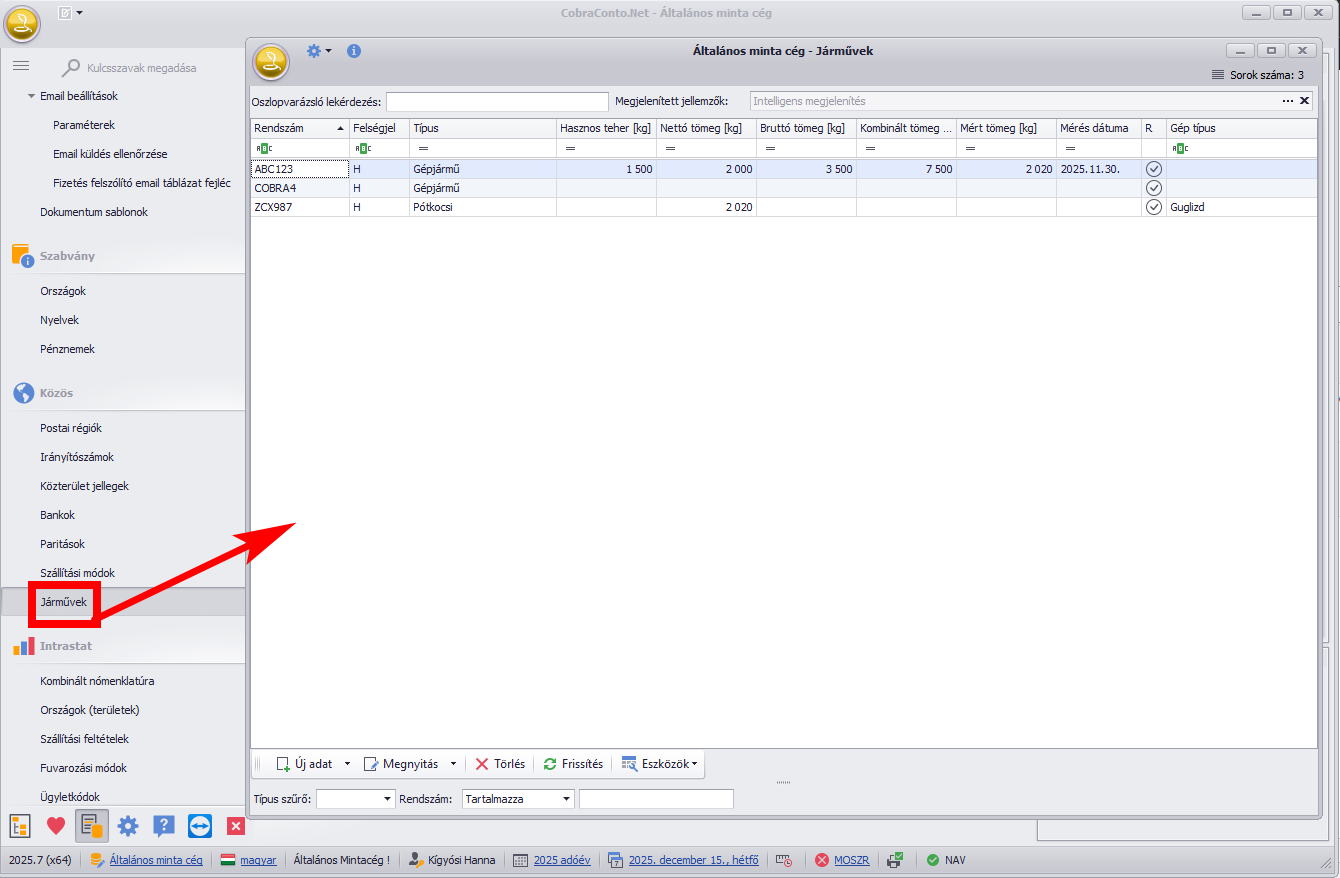 A Járművek adatait a Törzsadatok / Közös / Járművek menüpontban tarthatjuk karban: