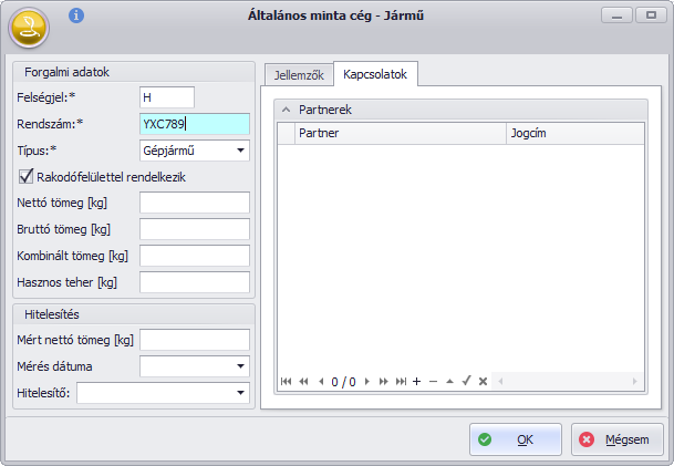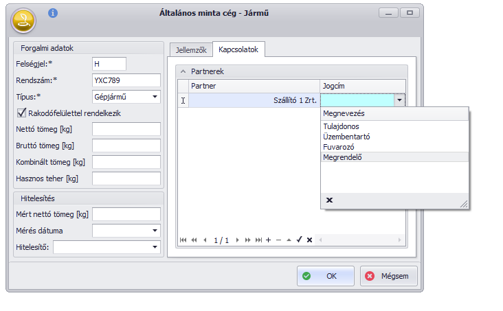 Szintén opcionális a gépjármű összerendelése partnerekkel, de a kezelőt később segíti a szállítólevél kitöltése során, hogy szűkített partnerkörből kell választania. A lehetséges kapcsolat jogcímek az alábbiakban láthatók: