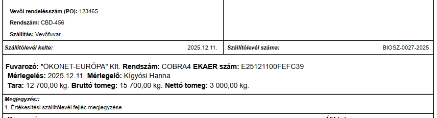 A Nettó tömeg (TARA, vagyis más néven terheletlen tömeg, a vontató és pótkocsi teljes tömege, amikor a jármű üres), a Bruttó tömeg és a hitelesítési (mérlegelés) adatok opcionálisak, de értékük szükséges, ha azt szállítólevélre kívánjuk nyomtatni:
