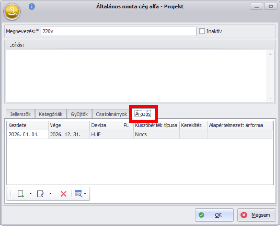 Kezdete* – Vége*: Az árazás érvényességének kezdete és vége dátuma. Egy projekthez több időszak árazása is rögzíthető, aszerint, hogy a szerződés(ek)ben milyen megállapodást kötöttünk.