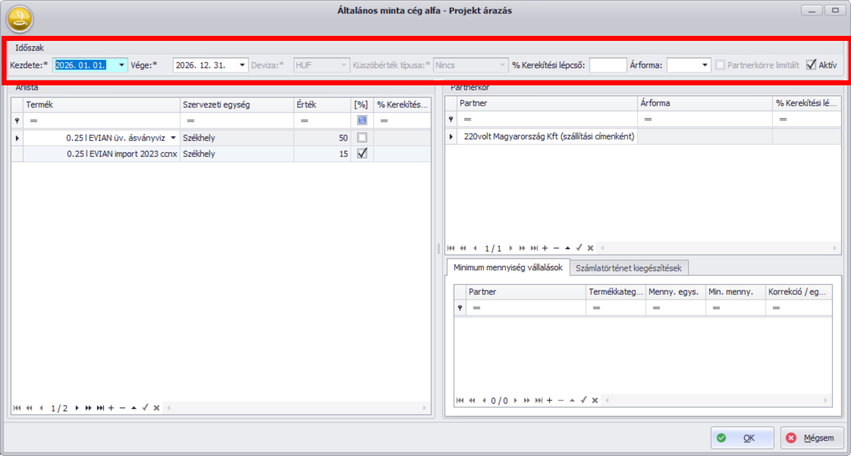 A 2026.2-es verziótól a projekt törzsadathoz árazási feltételek is kapcsolódhatnak. Ennek hatására a projektet számlán és értékesítési teljesítésen megadva, a megfelelő feltételek esetén (időszak, partner) a program az árazás alapján határozza meg a projektárazásban érintett termékeket.