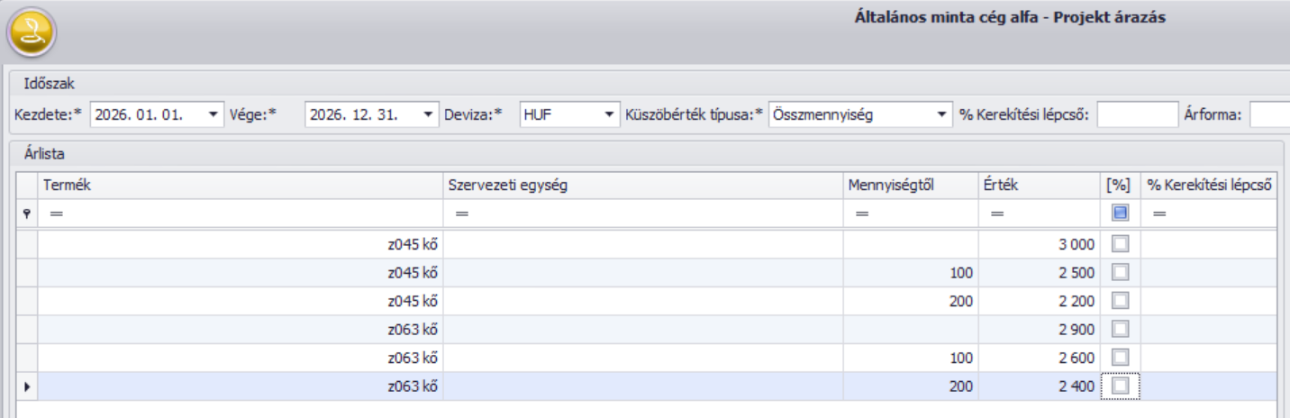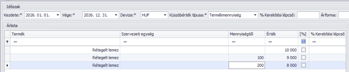 - Termékmennyiség: ebben az esetben egy terméknek több mennyiségi sávot adhatunk meg az árlistában. A Mennyiségtől oszlopban a 0-tól kötelező egy sávot megadni. Példánkban a terméket 0-tól 100 egységig 10000 HUF-ért, 100-tól nagyobb mennyiség esetén 9000 HUF-ért, 200 egységtől nagyobb mennyiségtől a pedig 8000 HUF-ért értékesítjük a projekt keretében. A már értékesített mennyiséget az aktuális, érvenyes sáv meghatározásakor mindig a véglegesített számlákon már szerepelő mennyiség alapján alapján határozza meg a program. Tehát nyilvántartást vezet róla, hogy az aktuális számlán az eladott termék éppen melyik mennyiségi sávba esik a korábbi értékesítések alapján a vevő partnél.