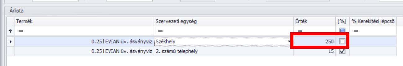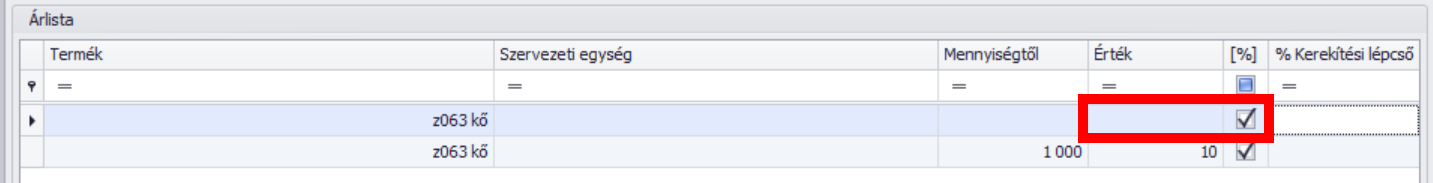 - Kerekítési lépcső: opcionális adat. A szoftver az itt megadott számmal végez számítást az alábbi módon csak %-os kedvezmény esetén: