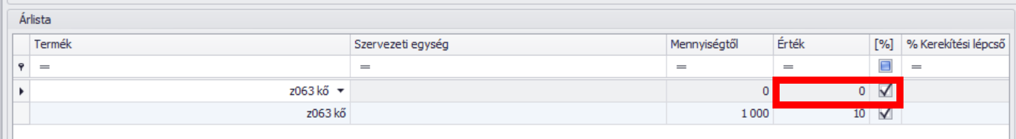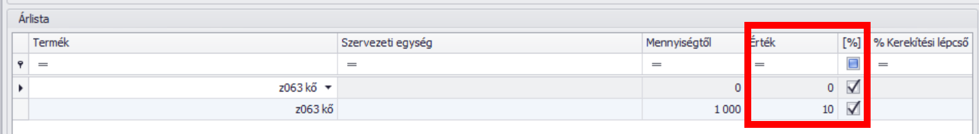 Fix árazás esetén az árlistában a termékhez fix árat adunk meg, mely a megadott feltételek esetén érvényesül, ilyenkor a [%] oszlop nem jelölt, tehát az Érték oszlopba írt ár kerül a bizonylatra.