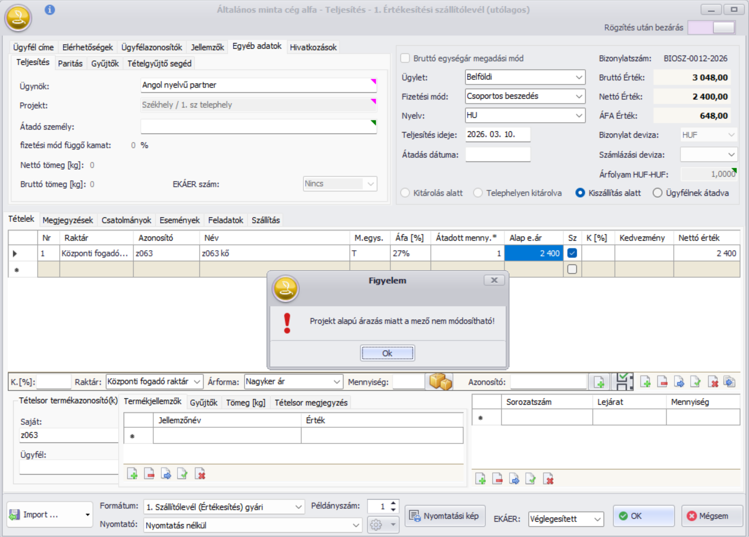 Amennyiben szerkeszteni próbáljuk a fentiek valamelyikét, a program figyelmeztet, hogy “Projekt alapú árazás miatt a mező nem módosítható!”.