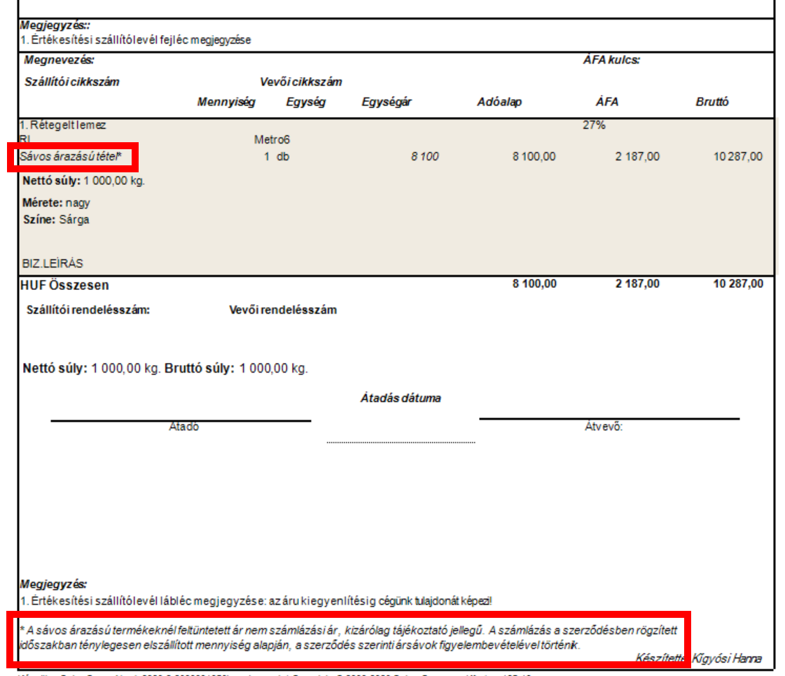 • sávos (tehát Termékmennyiség vagy Összmennyiség küszöbérték esetén) árazás során a teljesítésen meghatározott ár a már véglegesített számlákon eladott mennyiségeknek megfelelő sáv szerint árazódik, de mivel a teljesítés kitöltése és ennek végleges leszámlázása közötti időben készülhet új számla (vagy sztornózódhat), mely befolyásolja a használandó sávot, ez csak tájékoztató adat. Emiatt a Szállítólevél nyomtatványon ár megjelenítése esetén figyelmeztető üzenetet helyez el a program: