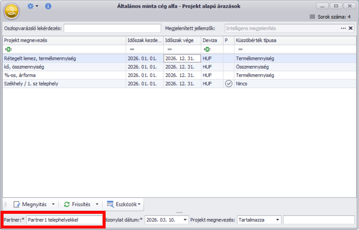• olyan bizonylatról, melyen a partner kitöltött, az ablak a partnert eleve a lenti szűrőben alkalmazva jeleníti meg az számba vehető projekt alapú árazásokat: